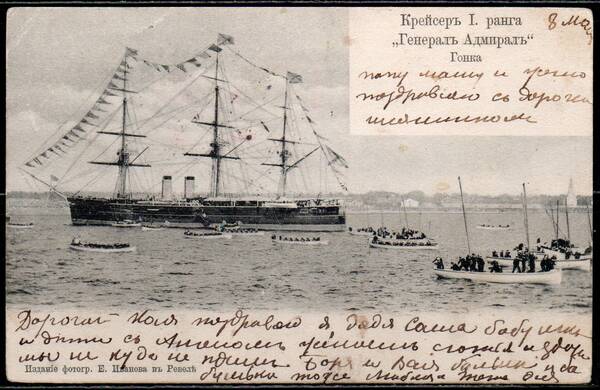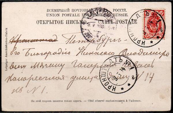 Штемпель отправления: "Кронштадтъ № 1 -9.05.1904 г * *". Штемпель прибытия: "Санкт-Петербург 9 V 1905".