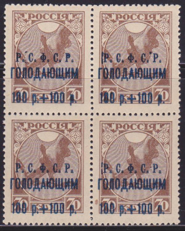 Синяя надпечатка 100 руб. на 70 коп. Дефект клише: Дополнительные чёрточки у буквы "Р" в Р.С.Ф.С.Р. - 2-ая и 4-ая марки. Во 2-ой марке апостроф - дополнителная точка между букв "С" и "Р" в Р.С.Ф.С.Р. Свой клей. |