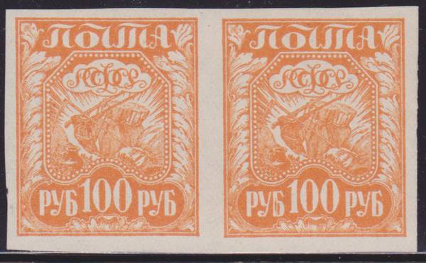 Литография. Без зубцов. Свой клей. Дефект клише - тёмный штрих в букве "Б" - в слове "РУБ" - 2-ая марка.