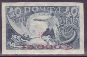 Красная типографская надпечатка на марке № 7. Дефект букв "С", "Ф", "С" и "Р" в слове "РСФСР", также разбит новый номанал "10.000". Размер 38,5 х 23. Свой клей! |