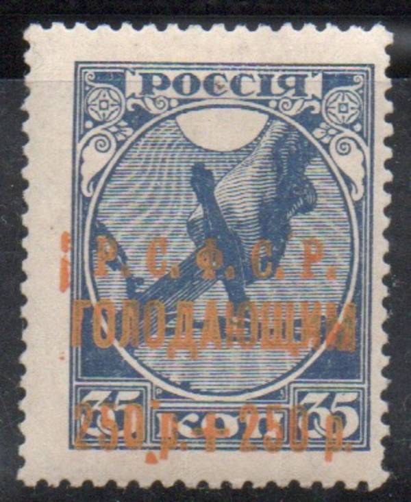 Черта " I Р.С.Ф.С.Р. " и точка после "250" в оранжевой надпечатке. 1 марка.