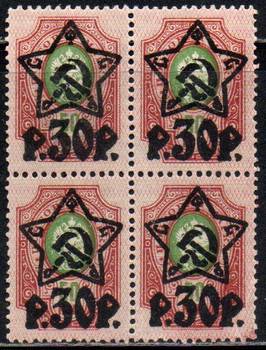 Литографская надпечатка Звезды и "Р. 30 Р." на 50 коп. Смазан фон. Квартблок.