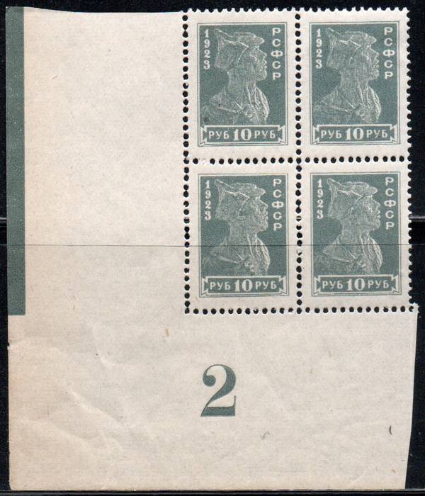 10 руб. серо-зелёная. Типография. Перф. Рам. 14 : 14 1/2. Контрольный знак "2" . Угловой Квартблок. Свой клей.
