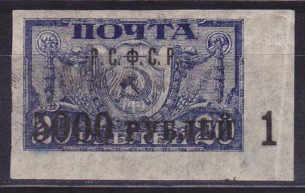 Чёрная типографская надпечатка: 5000 руб. на 20 рублях, синяя марка. Тонкая бумага. Без зубцов.
