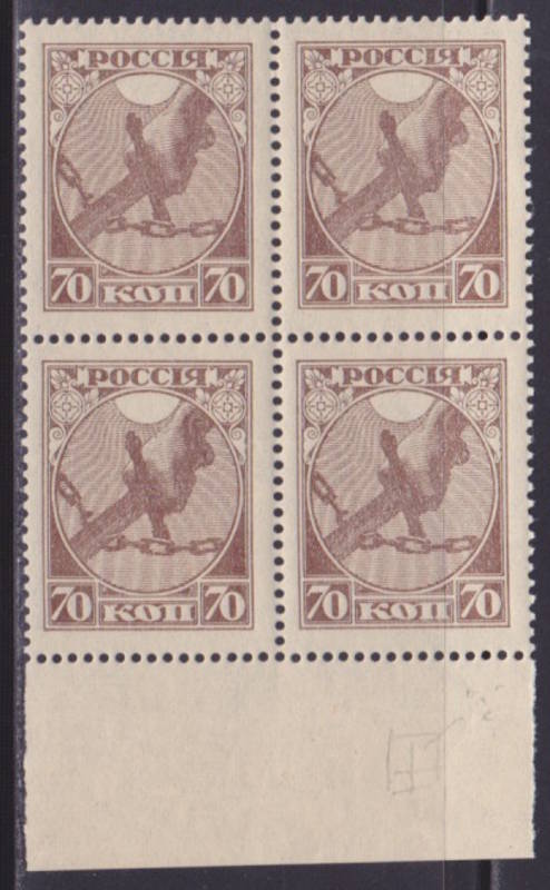 70 коп. Коричневая. Типография. Вертикальная меловая сетка. Зубцовка Гр. 13 1/2. Разбит правый лепесток - 2-ая марка. Нижнее поле листа.