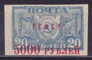 Сильный сдвиг ндпечатки 5000 руб. на 20 руб. на голубой марке. Без зубцов. Подлинный клей.
