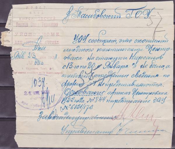 Штемпель отправления: "Кирсановъ 24.01.1923 л". Штемпель прибытия: "Тамбовъ 26.01.1923 к". Почтовое отправление франкировано 4-мя марками "поезд" из Серии Голодающим 1922 г. |