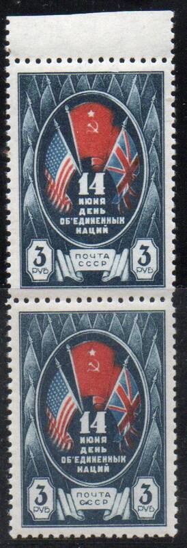 3 рубля. День Объединенных наций. Точка после первой буквы "С" в "СССР". Пара марок.