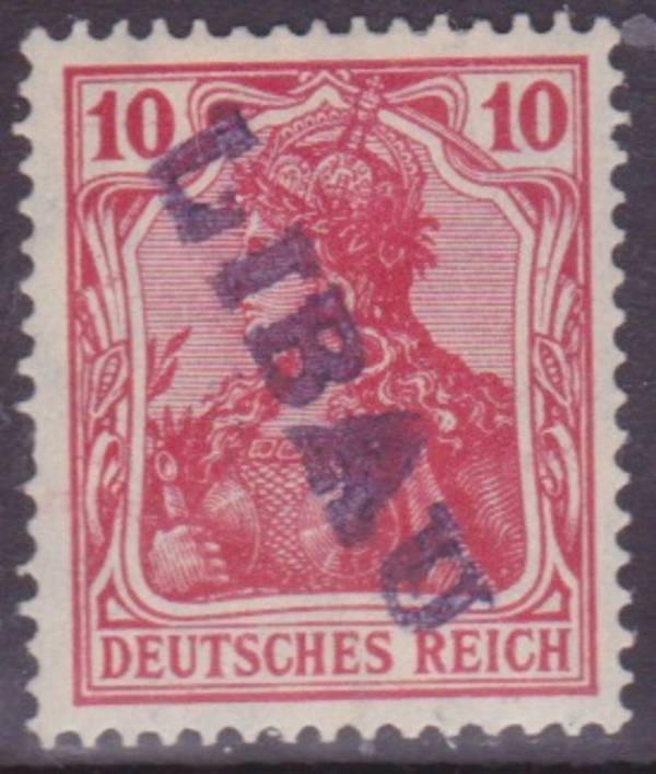 Фиолетовая надпечатка "LIBAU" на 10 пф. (карминовая). 1 марка.