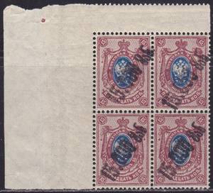 15000 на 15 коп. Чёрная Надпечатка на марке Российской Империи 1917г. Малый размер. С Зубцами. Квартблок с левым полем листа и водяным знаком по краю. Свой клей. |