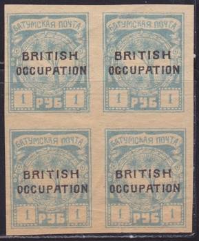Надпечатка " BRITISH OССUPATION " на 1 руб. Светло-голубая. Квартблок.