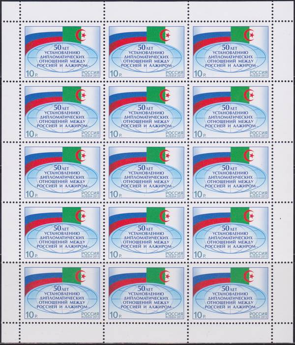 50 лет установлению дипломатических отношений между Россией и Алжиром. Лист из 15-ти марок.
