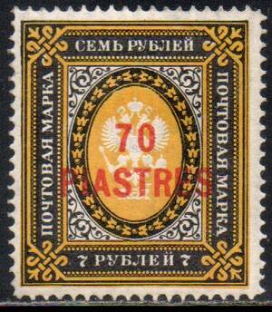 Красные типографские надпечатки "70 PIASTRES" на марке 7 рублях Российской Империи 1889-1902 гг.