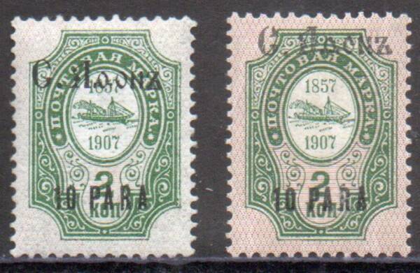 Надпечатка " С.Афонъ 10 PARA" на 2 коп. Плохо различимый фон. Пароход. 1 марка.