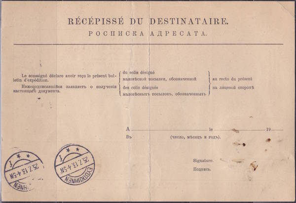 Сопроводительный Адрес франкирован марками Российской Империи 35 коп. х 3 шт. Стандартный выпуск + 25 коп. Алексей Михайлович из Романовской серии. |