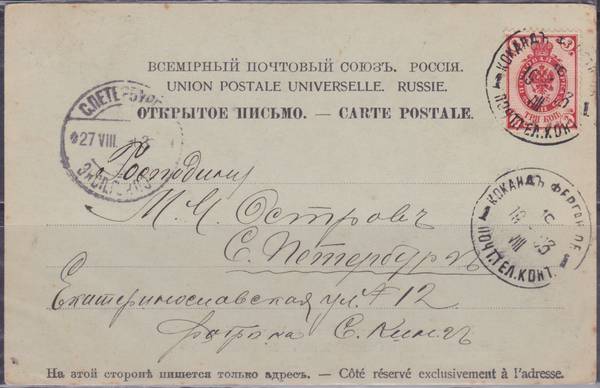 Почтовая Карточка 1903 год: Коканд Ферган. Обл. 19.08.1903 г. - Санкт-Петербург 27.08.1903 г. !
