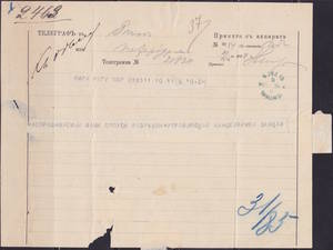 Бланк Телеграммы "Принята с аппарата" на Жёлтой бумаге. Голубой штемпель "Телеграфъ в Риге 10. VII. 1888 ".