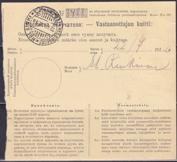 Перевод оплачен марками Российской империи 1909 года 3 коп. красная х 2 шт., 10 коп. и 50 коп.