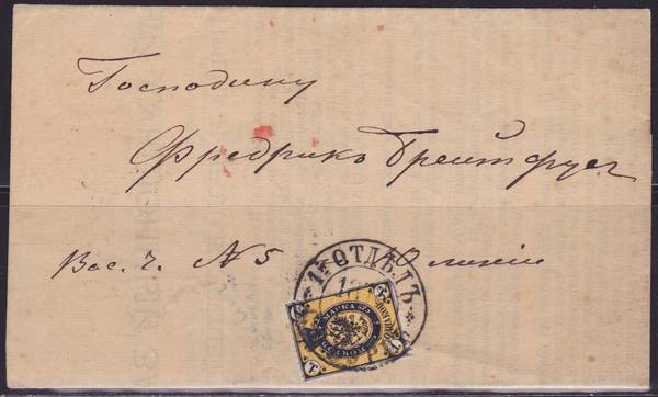 Чёрный штемпель " 1-й Отдель С.П.Бурга ". Письмо с " Условиями Приёма и Продажи Вещей " отправлено председателю С-Петербургского Общества Филателистов Ф. Брейтфусу. На обороте штемпель красного цвета " Санкт-Петербург 18 авг. 1878 ". |