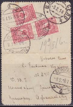 Заказная Секретка: Петроград - Царское Село. Франкировано 3-мя марками 4 коп. 1915 г.