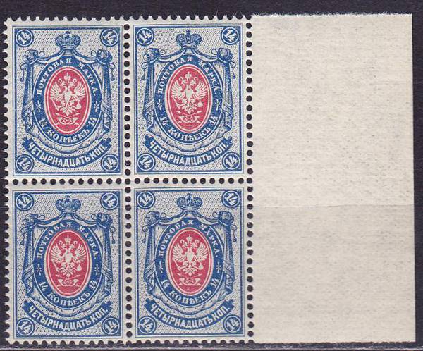 14 коп. Синяя/ Красная. Типография, без водяного знака. Зуб. Рам. 14:14 1/2. Вертикальная Меловая Сетка. Квартблок с полем.