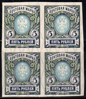 5 рублей. Синяя, зелёная, голубая. Жёлтая меловая сетка. Квартблок.