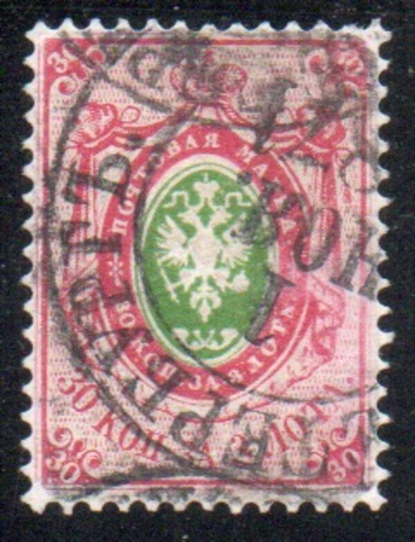 30 коп. Розовая / зелёная. Штемпель "Санкт-Петербург 1 ноя 1871". 1 марка.