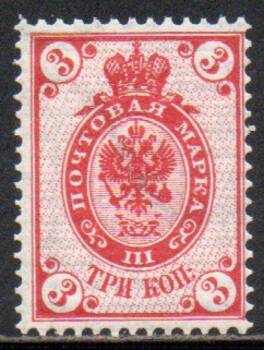 3 коп. Карминовая. Типография. " со стрелками ". Горизонтальный водяной знак. Перф. Рам. 14 : 14 1/2. Свой клей.