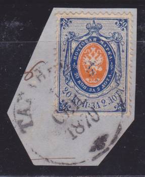 20 коп. синяя / оранжевая. Типография, горизонтальный водяной знак. Перф. Рам. 14 1/2 : 15. Календарный штемпель " Таганрог 1 сеню 1870 ". |