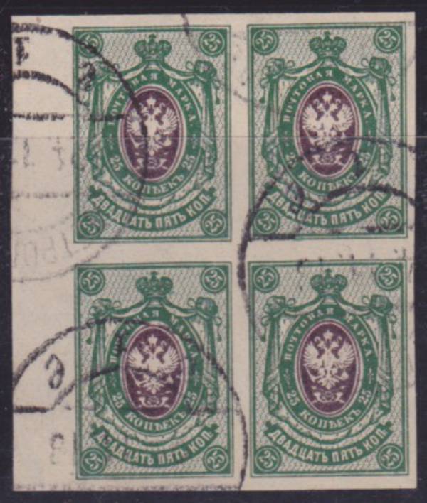 25 коп. Зелёная/ фиолетовая. Без зубцов. Погашена календарным штемпелем " Петроград 24.11.1918 ".