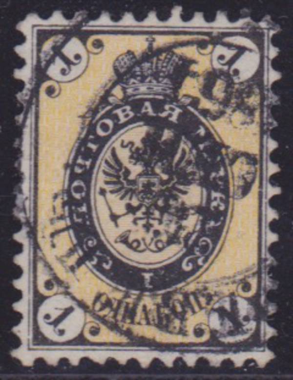 1 коп. чёрная / жёлтая. Типография, без водяного знака. Перф. Рам. 12 1/2. Круглый календарный штемпель 1864 года.