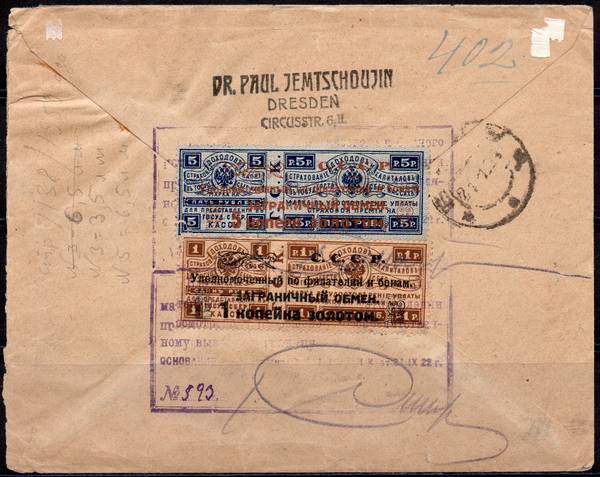Отправление франуировано марками золотого стандарта 1 коп. и 10 коп. Штемпель отправления: "Москва 16.01.1924 I экспедиция". На обороте две марки "Заграничного Обмена". Штемпель прибытия: "Баку 21.01.1924". |