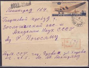 Заказное Письмо: Ереван - Ленинград. Франкировано Маркой Авиапочты 80 коп.