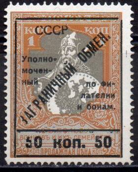 Надпечатка "Заграничный Обмен 50 коп. 50". Разбиты буквы. 1 марка.