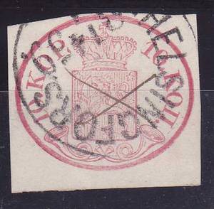 Овальная марка: 10 коп. Карминовая, Погашена Пером и Штемпелем. Сертификат S.Schwenson. Без Зубцов.