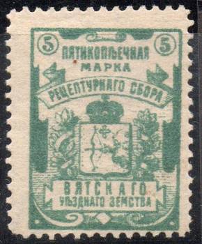 Вятского Уездного Земства 5 коп. Зелёная. Марка Рецептурного Сбора.