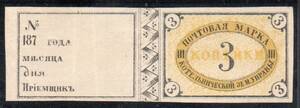 Котельнический уезд, 3 коп. Чёрная и жёлтая. 1 марка с купоном.