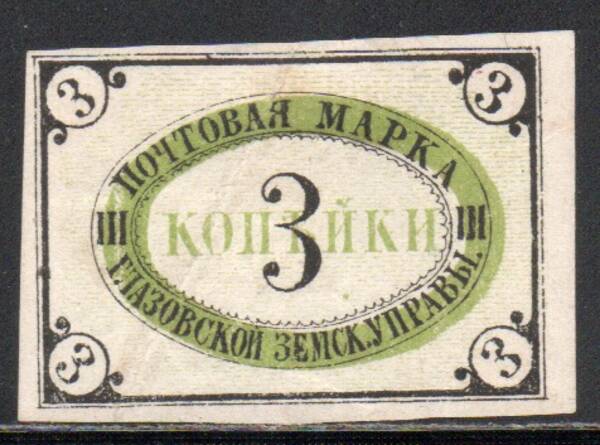 3 коп. Чёрная и жёлто-зелёная. Без зубцов. Жёлтый клей. Сдвиг зелёного фона. С наклейкой.