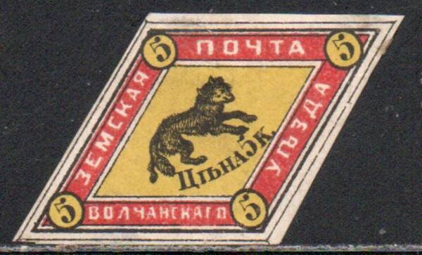 Волчанский уезд 5 коп. чёрная, зеленовато-жёлтая, лилово-красная. 1 марка.