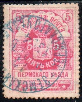 Пермский уезд, 5 коп. Карминов-розовая. Герб Перми. 1 марка.