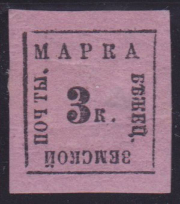3 коп. Чёрная на лилово-фиолетовой бумаге. Литография. Без зубцов. Неблольшое утоньшение на клеевой стороне.
