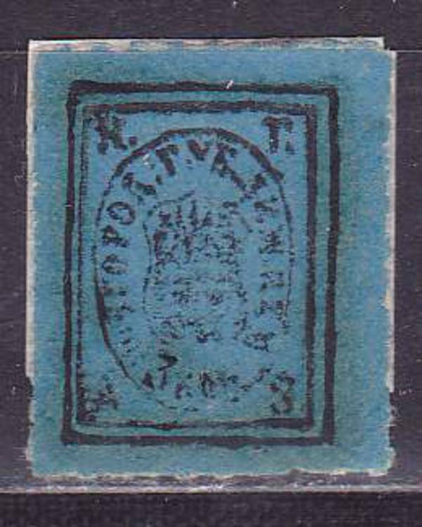 3 коп. чёрная на синей бумаге. Ручной штемпель на сероватой бумаге, окрашенной с поверхности.