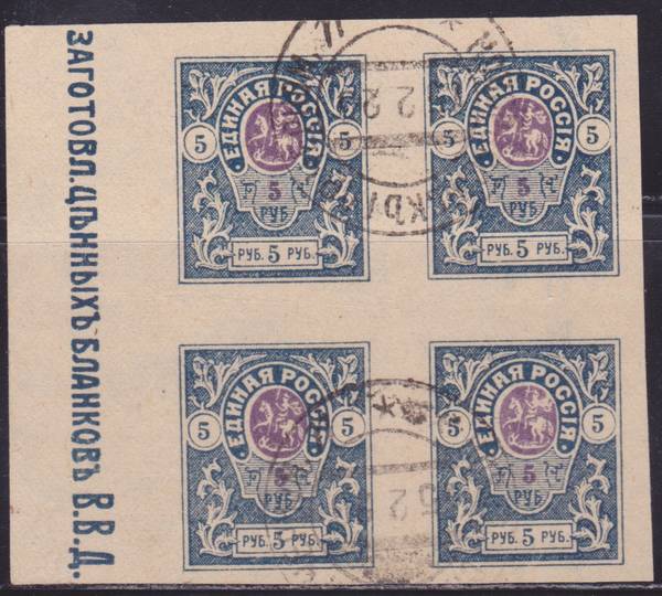 Контрольный Знак "...заготовл. ценныхъ бланков В.В.Д... " на Поле Листа. Марки погашены календарным штемпелем " Новороссiйскъ гор. черном. 15.2.20 ** и ". Без тонких мест, без клея! |