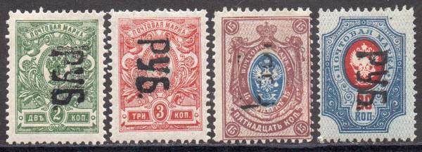 Подборка из 4-х марок с надпечаткой "РУБ." ( сверху вниз ) и 15 коп. ( снизу вверх ). С клеем, некоторые марки с лёгкими наклейками, некоторые без наклеек. |