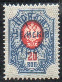Синяя литографская надпечатка " Приамурский Земский Край " на марке 20 коп. С зубцами. Заверка "ROMEKO PARIS".
