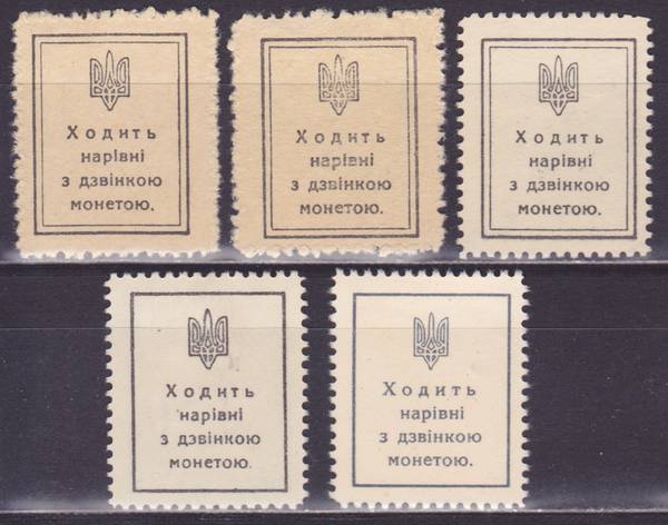 Украина 1918 год, Центральная Рада: Марки-Деньги, Отпечатаны на Тонком Картоне, 5 марок.