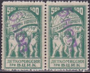 Литография. Фиолетовая надпечатка "5 КОП." на 500 руб. Остатки своего клея.