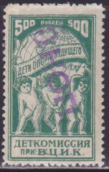 Литография. Фиолетовая надпечатка "5 КОП." на 500 руб. Остатки своего клея.