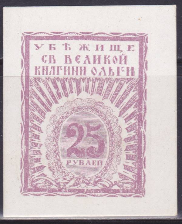 25 руб. Светло-лиловая. Убежище Св. Великой Княгини Ольги. 1 марка.