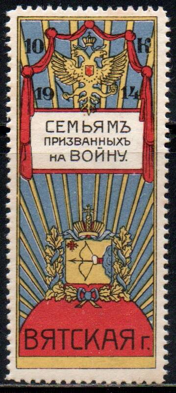 10 коп. 1914 г. Вятской Губ. Семьям Призванных на Войну. 1 марка.